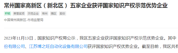 2023/11/21喜報!江蘇博之旺自動化設備有限公司獲評國家知識產權優(yōu)勢企業(yè)!